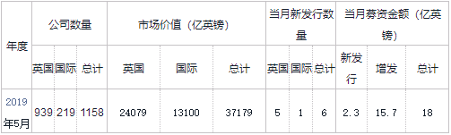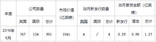 2019年5月,伦交所主板市场新增了6家上市公司,其中2家为并购发行成立的新公司,1家为引荐上市,其余3家公司均为新上市公司。这3家新公司上市时的市值均超过100万英镑。其中,来自支持服务行业的Finablr PLC公司(代码:FIN)上市时市值约为12.25亿英镑,当月通过发行超过8765万股股份募集了1.5339亿英镑;Riverstone Credit Opportunities Income PLC公司(代码:RCOI)上市当月通过发行1亿股股份募集了7680万英镑。而Bermele PLC公司(代码:BERM)上市时市值为200万英镑,当月通过发行1亿股股份募集了100万英镑。